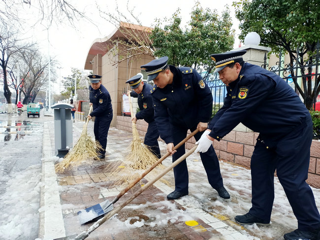 市城管执法支队以雪为令 ,组织队员快速行动 ,积极动员沿街单位商户进行门前三包区域清扫的同时,对城区道路积雪盲点部位进行清理 。