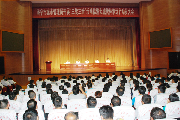 9月12日,市局在声远舞台隆重召开开展“三转三新”活动推进大城管体制运行动员大会,深入贯彻落实省、市城市管理体制改革会议精神,进一步认清形势、统一思想,打开思路、提升境界,坚定发展的信心和决心,奋力开创我市城市管理工作新局面。市局领导班子全体成员;市纪委派驻第二纪检组领导;各县市区执法局(城管局)主要负责人、法规科长;规划支队、中区分局、任城分局全体人员;高新分局、太白湖分局班子成员、大队长、科室负责人;市政工程处、园林局、环卫处全体在编人员;市局机关全体人员等共700余人参加会议,会议还邀请了中山水务、华润燃气、四和热力、东郊热电厂、任城区供电公司的主要负责人参加。