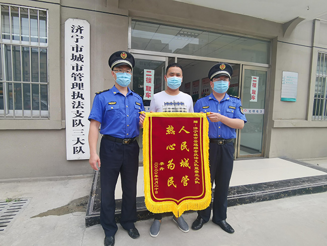 6月21日上午,一名市民群众携家人将一面写有“人民城管,热心为民”的锦旗送至市城管综合执法支队执法监察三大队,以表达城管执法人员对其救助的感激之情。